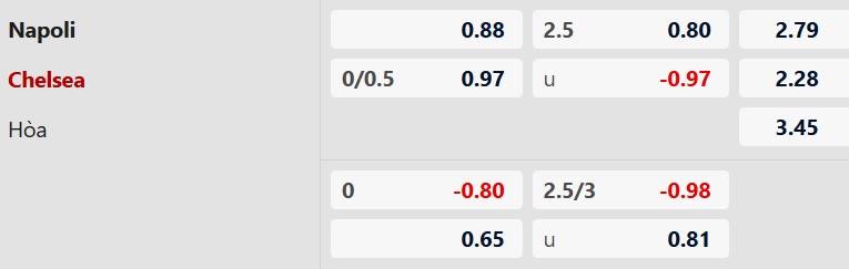 Chelsea thắng theo châu Á: Trong khi Chelsea thắng theo châu Á 5/6 trận sân khách gần đây, thì Napoli đang có chuỗi 4 trận thua theo châu Á liên tiếp. Khi đội chủ nhà tỏ ra kém duyên như vậy, các nhà đầu tư nên ủng hộ đội khách chứ không phải Napoli.