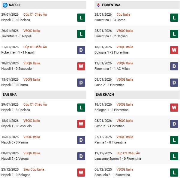 Thống kê phong độ Napoli vs Fiorentina: