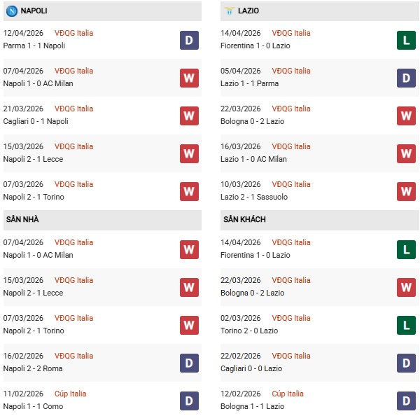 Thống kê phong độ Napoli vs Lazio: