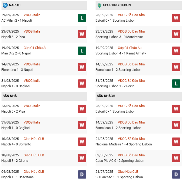 Thống kê phong độ Napoli vs Sporting Lisbon: