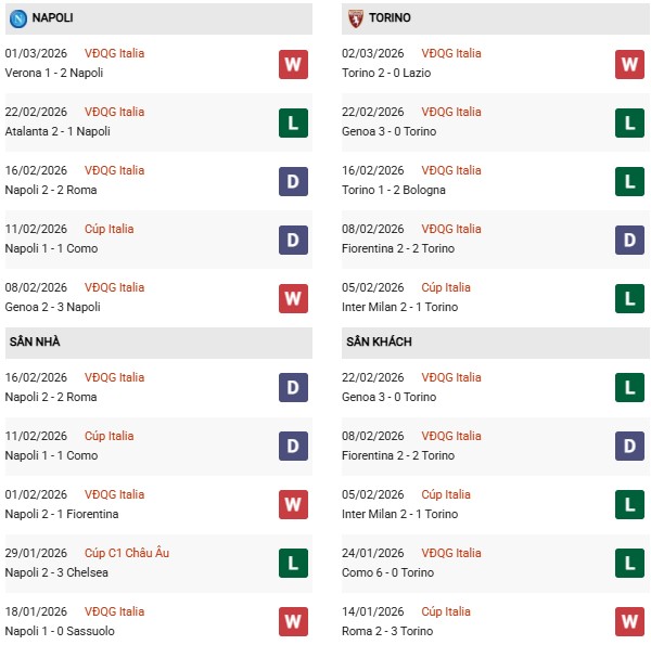 Ở vòng đấu mới nhất, Napoli và Torino đều giành chiến thắng trước các đối thủ như Verona và Lazio. Trên BXH Serie A 2025/26, Napoli đứng thứ 3 khi có 53 điểm còn Torino xếp thứ 14 khi có 30 điểm.