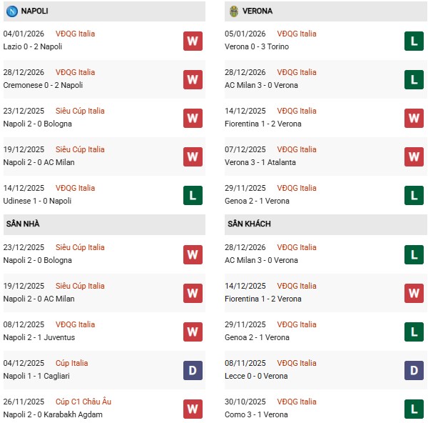Thống kê phong độ Napoli vs Verona: