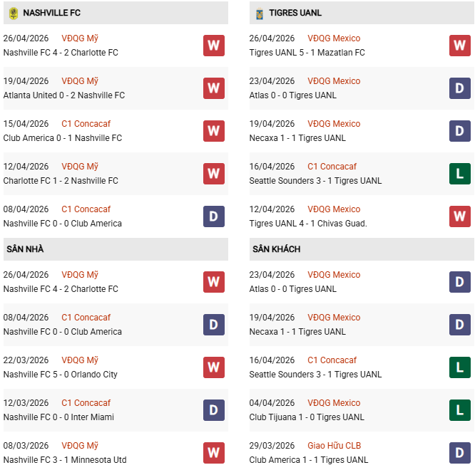 Nhận định Nashville vs Tigres UANL, 07h30 ngày 29/4, Bán kết CONCACAF Champions Cup, sân Geodis Park. Dựa trên phong độ hủy diệt trên sân nhà của Nashville và sự thiếu ổn định của Tigres UANL khi phải hành quân xa nhà, đại diện Hoa Kỳ có nhiều cơ hội để ca khúc khải hoàn.