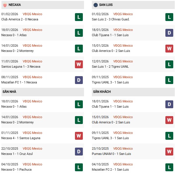 Thống kê phong độ Necaxa vs San Luis: