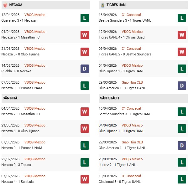 Ngược lại, Tigres UANL chỉ thắng 1/8 trận sân khách gần đây. Khả năng cao, Necaxa sẽ có 3 điểm ở trận này.