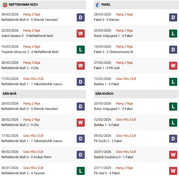 Thành tích đối đầu Neftekhimik vs Fakel: