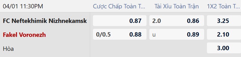Thông tin tỷ lệ cược Neftekhimik vs Fakel: