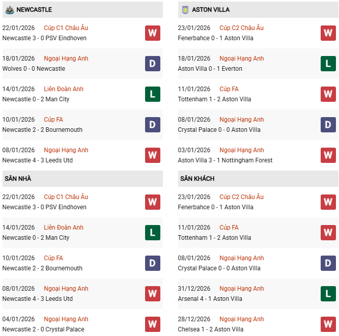 Thống kê phong độ Newcastle vs Aston Villa:
