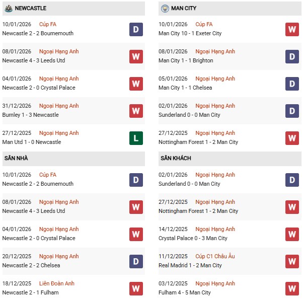 Thống kê phong độ Newcastle vs Man City: