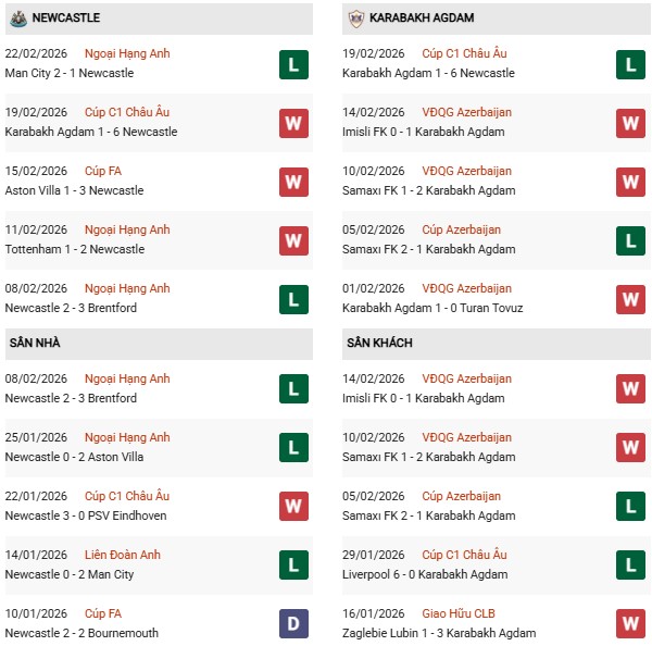 Thống kê phong độ Newcastle vs Qarabag: