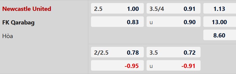Thông tin tỷ lệ kèo bóng đá Newcastle vs Qarabag: