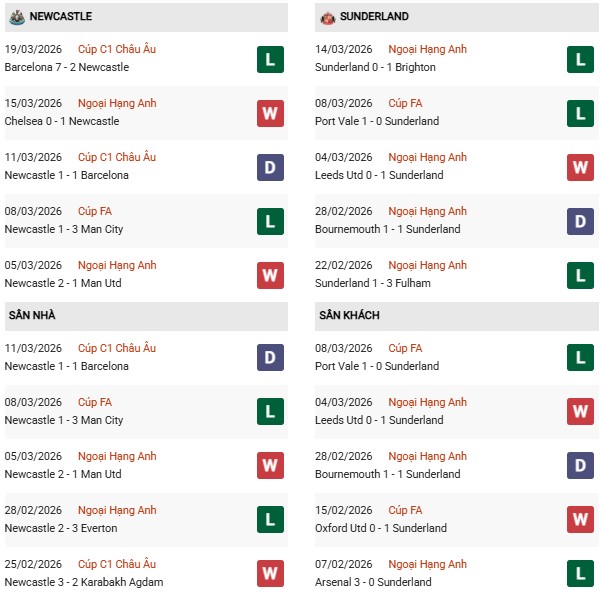 Số liệu thống kê về Newcastle gặp Sunderland: