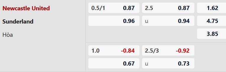 Thông tin tỷ lệ bóng đá Newcastle vs Sunderland: