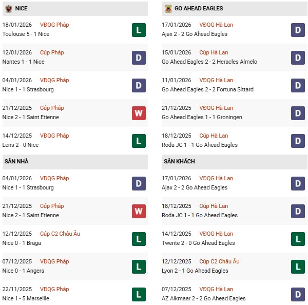 Thống kê phong độ Nice vs Go Ahead Eagles: