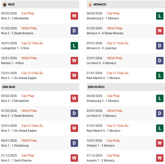 - Nice thắng 3, hòa 2, thua 5 trong 10 trận gặp Monaco gần đây.