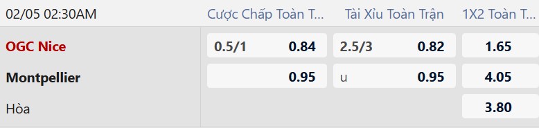 Thông tin tỷ lệ kèo Nice vs Montpellier: