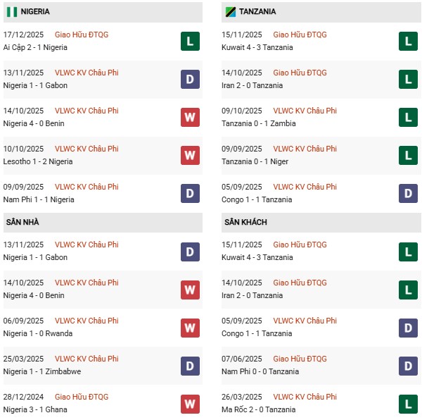 Tanzania xếp hạng 112 trên BXH FIFA, thấp hơn rất nhiều so với Nigeria, phản ánh rõ sự chênh lệch về đẳng cấp. Phong độ của đội bóng này thời gian qua cũng không quá ấn tượng với 3 chiến thắng, 2 trận hòa và 5 thất bại trong 10 trận gần nhất. Khi đối đầu với các đội bóng mạnh tại châu Phi, Tanzania thường chủ động lùi sâu đội hình, ưu tiên phòng ngự số đông và chờ đợi cơ hội từ các tình huống phản công hiếm hoi.
