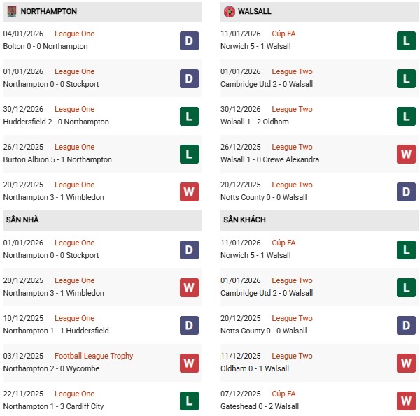 - Northampton thắng 3, hòa 3, thua 4 trong 10 trận gặp Walsall gần đây.