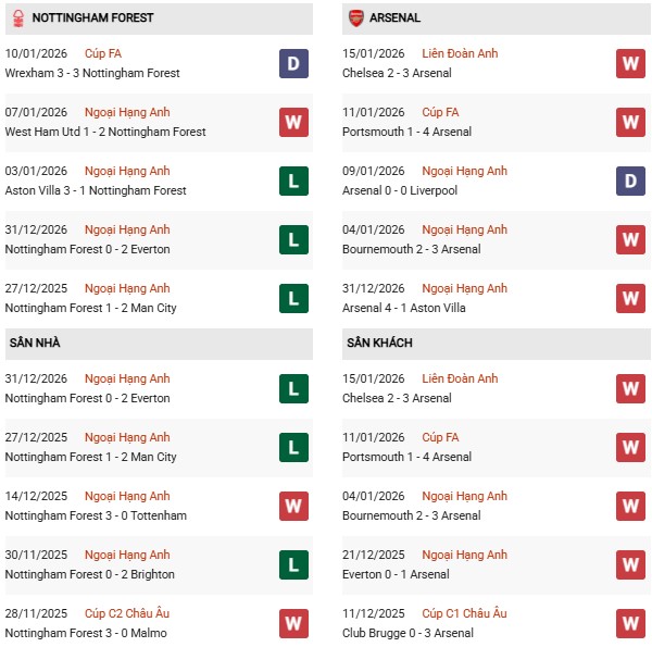 Thống kê phong độ Nottingham vs Arsenal: