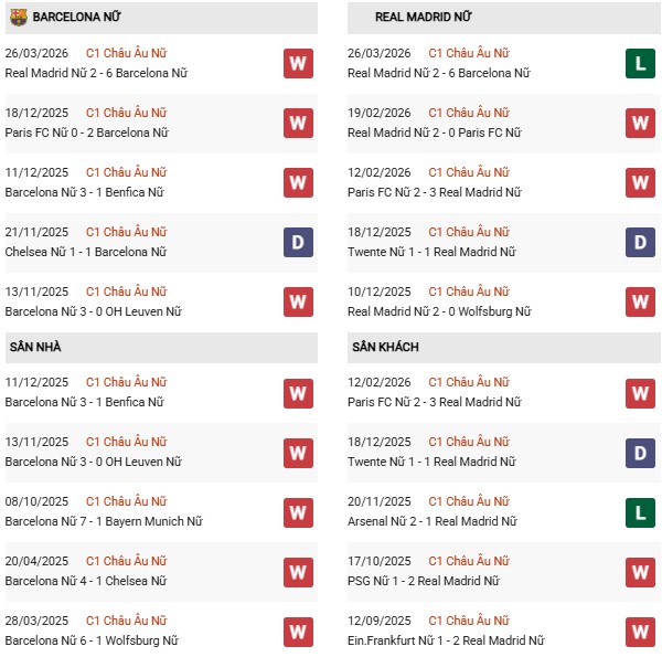 Thống kê phong độ Nữ Barcelona vs Nữ Real Madrid: