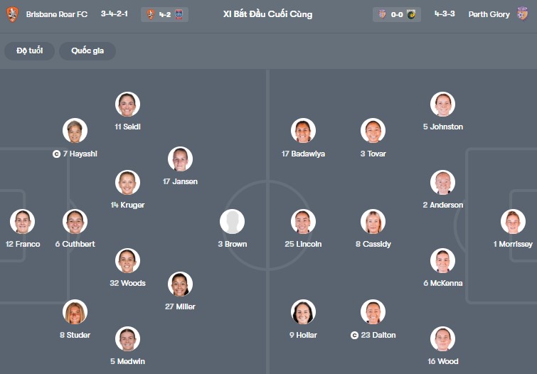 Đội hình dự kiến Nữ Brisbane Roar vs Nữ Perth Glory: