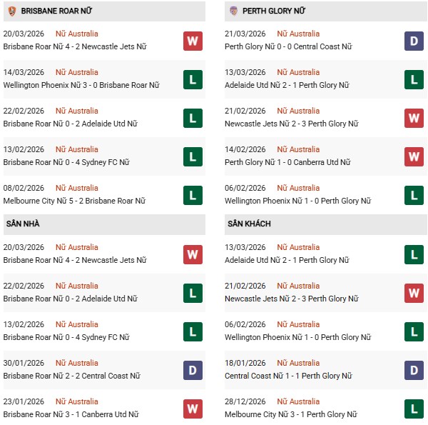 Thống kê phong độ Nữ Brisbane Roar vs Nữ Perth Glory: