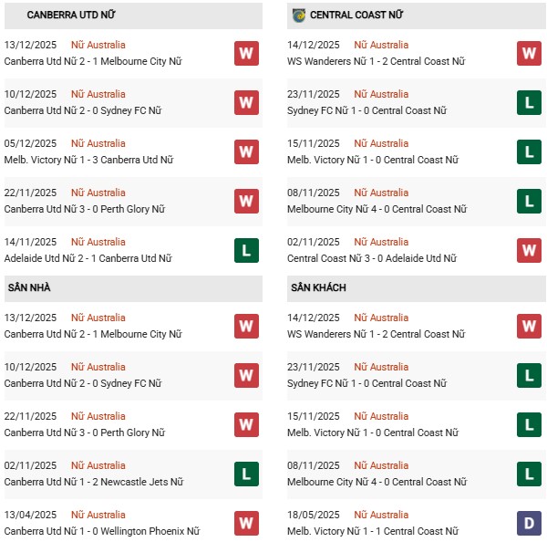 Thống kê phong độ Nữ Canberra vs Nữ Central Coast: