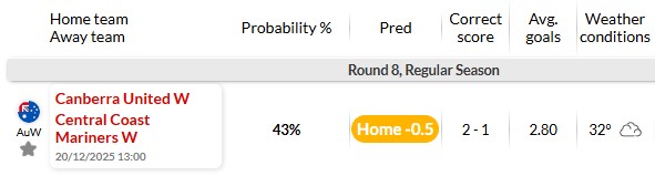 Nữ Canberra United đang đứng thứ 2 trên bảng xếp hạng với 10 điểm sau 6 vòng đấu. Dù hơn đội xếp thứ 7 là Melbourne City 3 điểm, nhưng việc đã thi đấu nhiều hơn tới 2 trận khiến lợi thế của họ chưa thực sự an toàn. Thành tích 3 chiến thắng, 1 trận hòa và 2 thất bại phản ánh sự ổn định tương đối của đội chủ nhà.