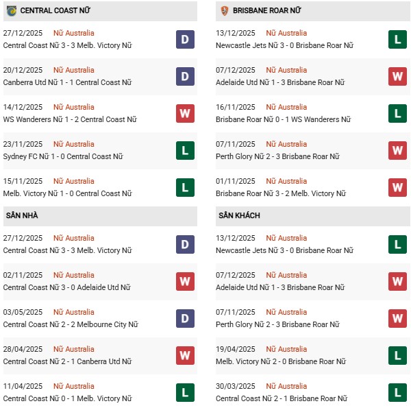 - Trên sân nhà, Nữ Central Coast thắng 1, thua 1 trước Nữ Brisbane Roar.