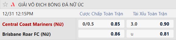 Thông tin tỷ lệ kèo Nữ Central Coast vs Nữ Brisbane Roar: