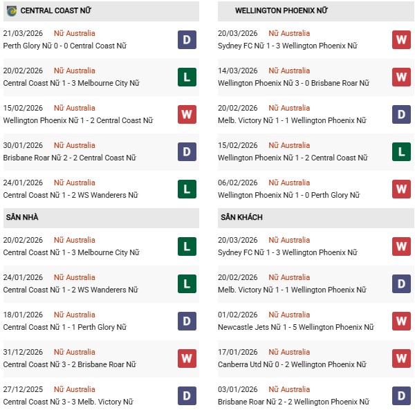 - Trên sân nhà, Nữ Central Coast thắng cả 2 trận trước Nữ Wellington.