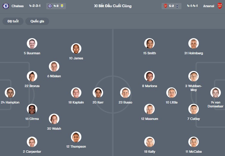 Đội hình dự kiến Nữ Chelsea vs Nữ Arsenal: