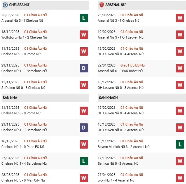 - Trên sân nhà, Nữ Chelsea thắng 8, thua 1 trước Nữ Arsenal.