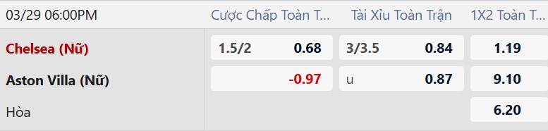 Soi kèo châu Á Nữ Chelsea vs Nữ Aston Villa:
