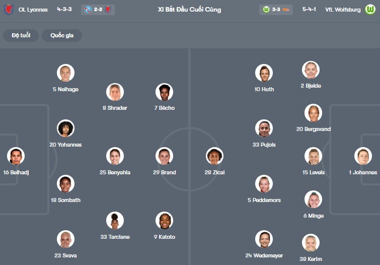 Đội hình dự kiến Nữ Lyon vs Nữ Wolfsburg: