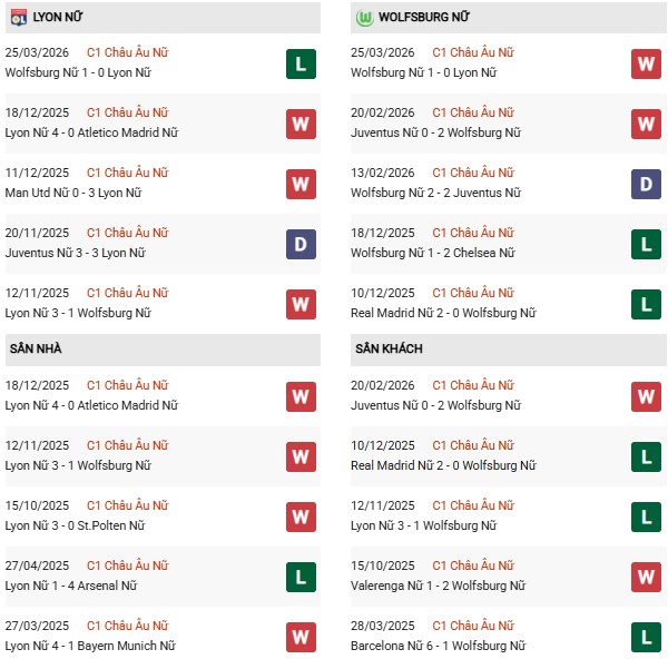 Thống kê phong độ Nữ Lyon vs Nữ Wolfsburg: