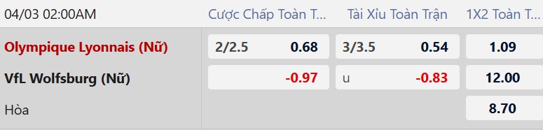 Thông tin tỷ lệ kèo Nữ Lyon vs Nữ Wolfsburg: