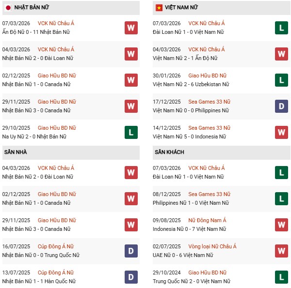 Thống kê phong độ Nữ Nhật Bản vs Nữ Việt Nam: