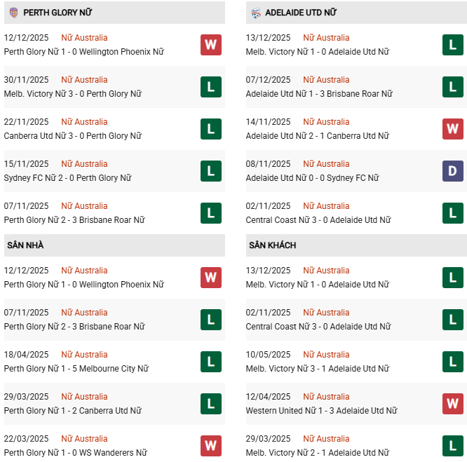 Thống kê phong độ Nữ Perth Glory vs Nữ Adelaide: