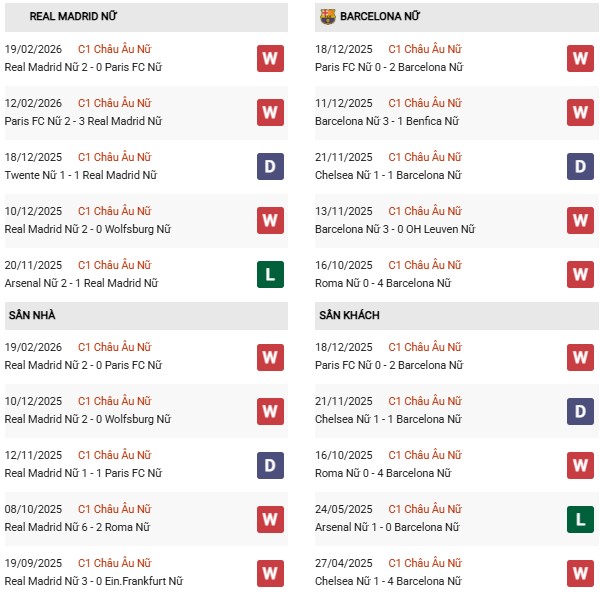 Thống kê phong độ Nữ Real Madrid vs Nữ Barcelona:
