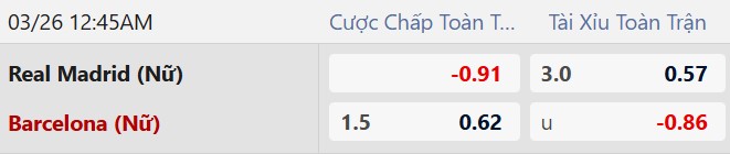 Thông tin tỷ lệ Nữ Real Madrid vs Nữ Barcelona: