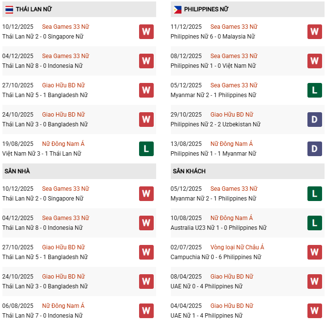 Thành tích đối đầu Nữ Thái Lan vs Nữ Philippines: