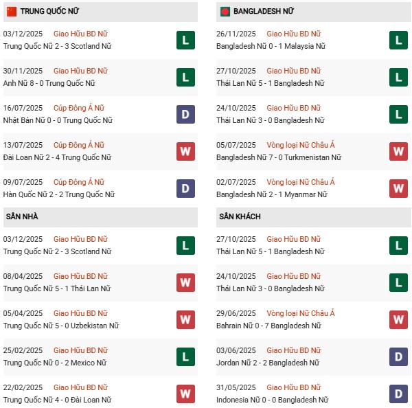 Thống kê phong độ Nữ Trung Quốc vs Nữ Bangladesh: