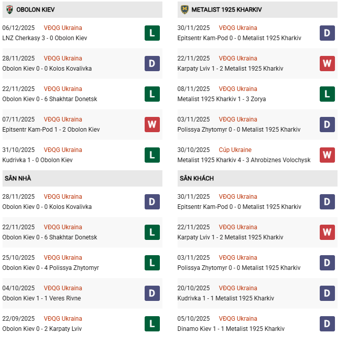 Thống kê phong độ Obolon Kiev vs Metalist 1925: