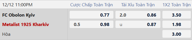 Thông tin tỷ lệ Obolon Kiev vs Metalist 1925:
