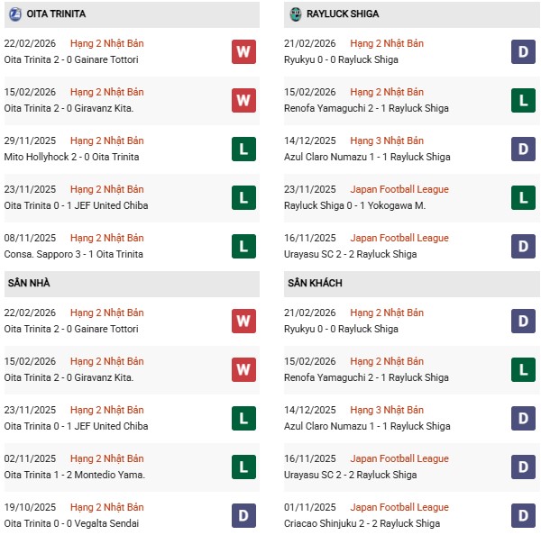 Thống kê phong độ Oita Trinita vs Rayluck Shiga: