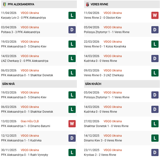 - Trên sân nhà, Oleksandriya thắng 3, hòa 1 trước Veres Rivne.