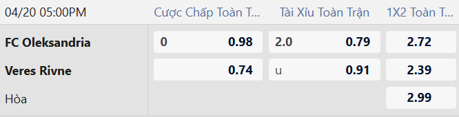 Thông tin tỷ lệ Oleksandriya vs Veres Rivne: