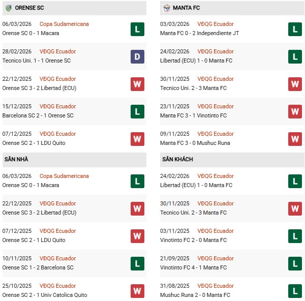 - Orense thắng 3, hòa 5, thua 2 trong 10 trận gặp Manta gần đây.