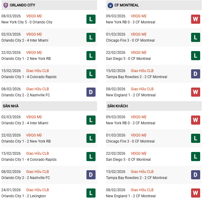 Thống kê phong độ Orlando City vs CF Montreal: